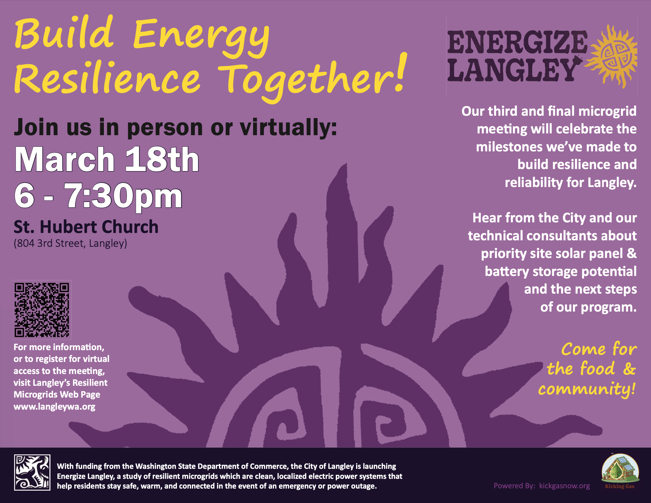 Join Energize Langley for our final community workshop to hear the results of the Feasibility Studies! This project is being led by local environmental leaders from Kicking Gas and Site Story, who are managing outreach and community engagement. Engineering expertise is being provided by Cascadia Renewables and Maul Foster & Alongi. Together, this team is working with the City to evaluate potential community sites that could serve as “resilience hubs”—locations that provide critical services powered by on-site solar and battery storage during outages, such as: